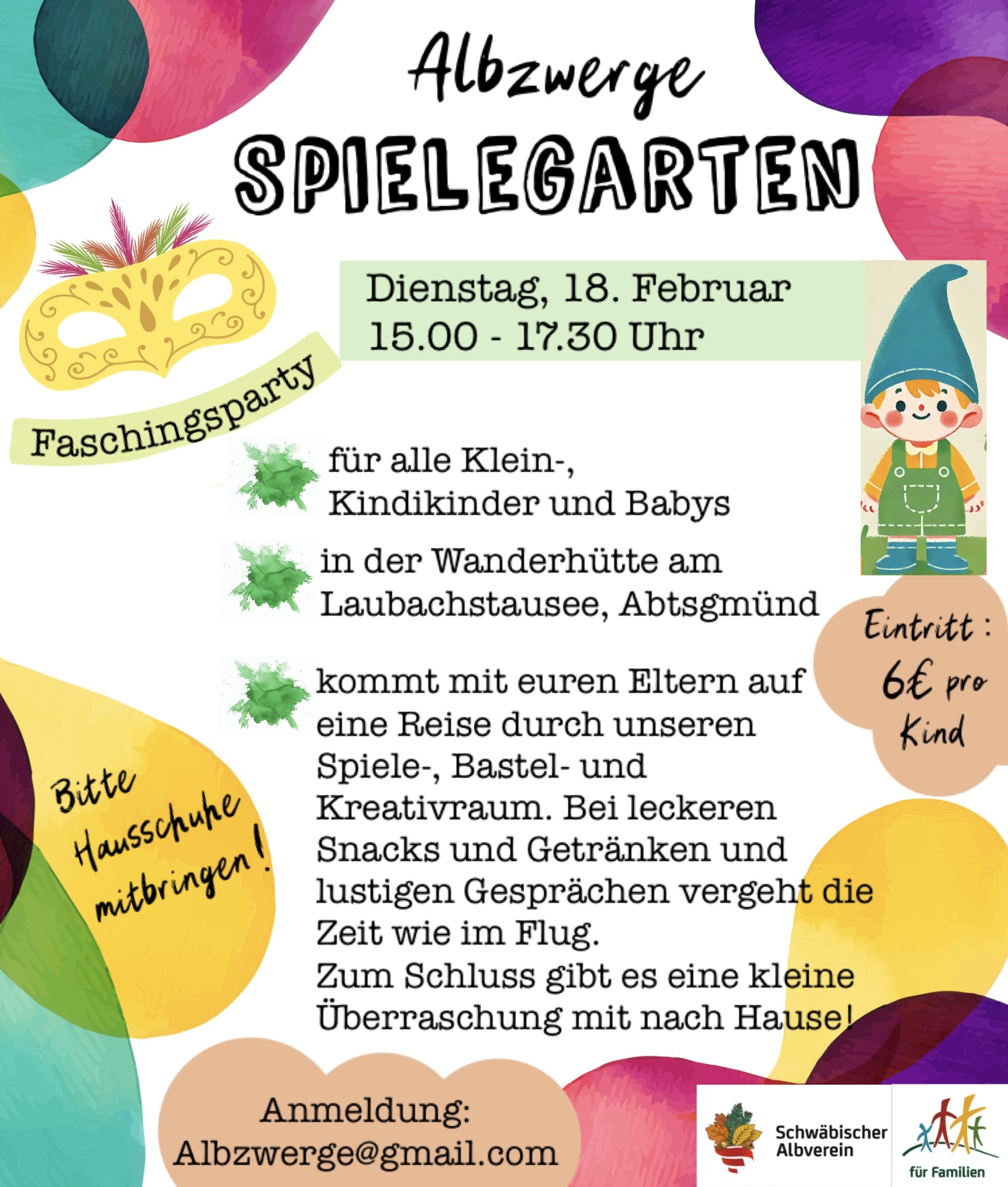 Im Rahmen einer kleinen Faschingsparty laden wir unsere Albzwerge-Babys und Minis zum Spielegarten ins Wanderheim ein. Info’s siehe Flyer. Wir freuen uns über Euer zahlreiches Erscheinen.