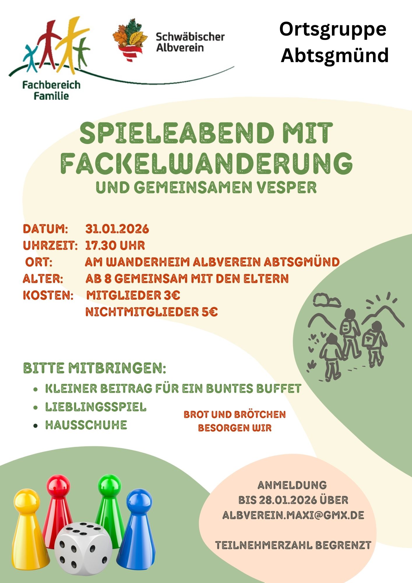 am Samstag, 31.1.26 starten die Albzwerge.Maxis ins Jahresprogramm 2026. Wir treffen uns um 17.30 Uhr am Wanderheim zu einer kurzen Fackelwanderung. Im Anschluß wollen wir im Wanderheim mit Gesellschaftsspielen den Abend verbringen. Weitere Informationen könnt ihr dem angehängtem Flyer entnehmen. Das Orga-Team Marika Kohl und Anne Kuhn freut sich über Eure Anmeldungen.