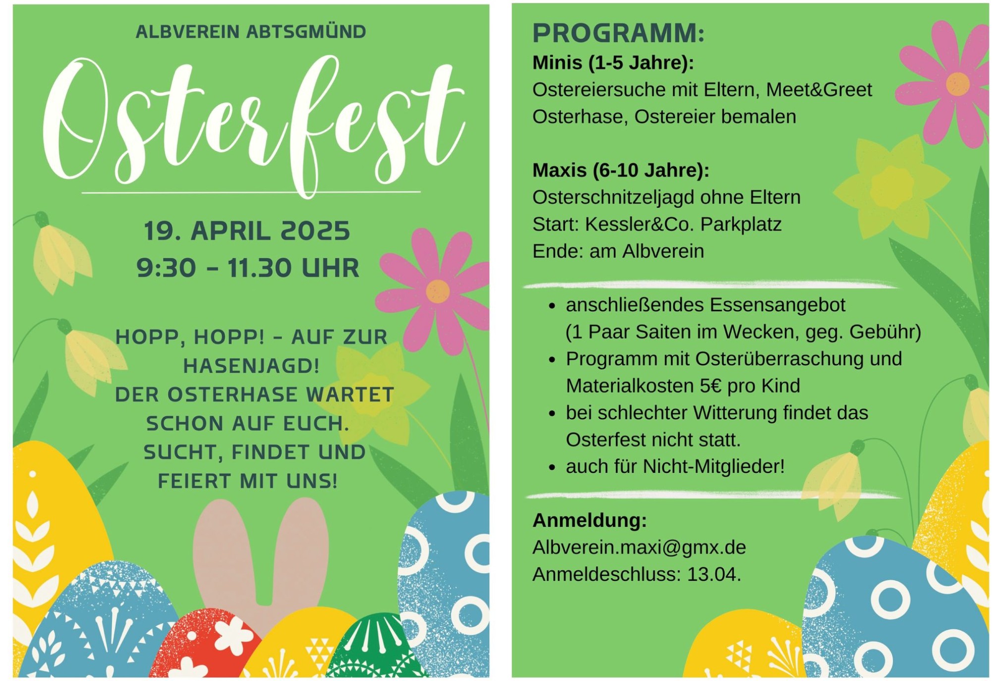 im nebenstehenden Flyer könnt Ihr Euch die Informationen zum Oster-Event am Wanderheim herauslesen. Bitte meldet Euch rechtzeitig an, wir freuen uns auf Euch. Evtl. Fragen beantworten Sabrina, Lena, Silke oder Marika.