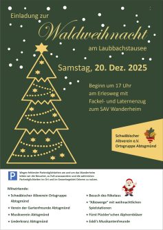 Wieder einmal steht Weihnachten vor der Tür. In unserem Jahresprogramm ist die traditionelle Waldweihnacht ein fester Bestandteil und nicht mehr wegzudenken. Diese gestalten wir zusammen mit den Abtsgmünder Gartenfreunden. Der Liederkranz und der Musikverein tragen ebenso zur Gestaltung bei wie eine Gruppe von Alphornbläsern, sowie Eddi’s Musikantenfreunde. Wir starten wie immer um 17.00 Uhr mit einem Fackel-und Laternenzug am Eingang des Erlesweges. Durch die mit Kerzenlicht erleuchtete Erlesklinge geht es auf das Albvereinsgelände, wo für das leibliche Wohl bestens gesorgt ist. Wir freuen uns über zahlreiche Besucher und bitten diese nach Möglichkeit zu Fuß zu kommen, da die Parkplatzsituation am Wanderheim begrenzt ist.